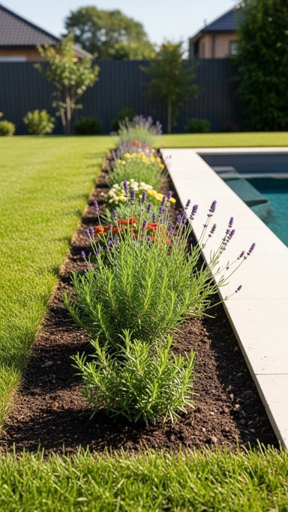 Most people forget they can garden near the pool, too. A narrow border for herbs or flowers brings fragrance, color, and a soft transition between the water and the yard.