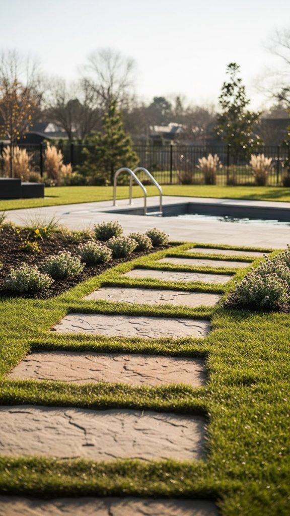 A stone path feels grounded, welcoming, and beautifully practical. Instead of walking across plain grass or concrete, a path invites people to the pool like a little garden feature.