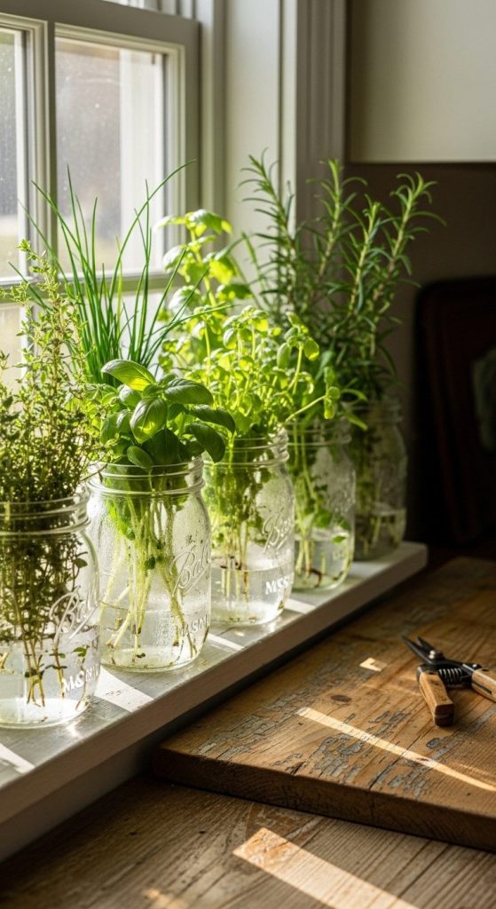 Who knew kitchen storage could double as a garden? Mason jars are perfect for small herb plants like thyme or chives, especially in tight spaces.