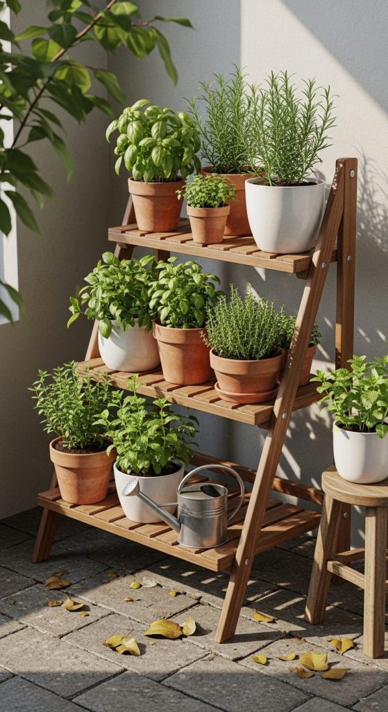 A tiered stand (wooden, metal, or bamboo) lets you grow multiple herbs in a small footprint — think of it as a mini garden tower.