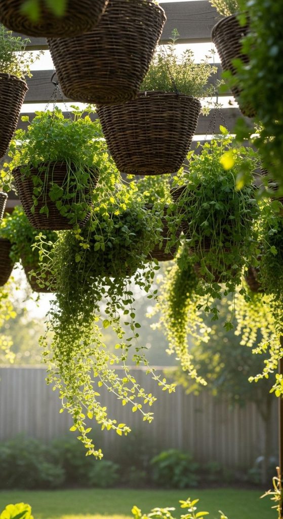 Hanging baskets aren’t just for flowers — they’re great for herbs like parsley, oregano, and mint.
