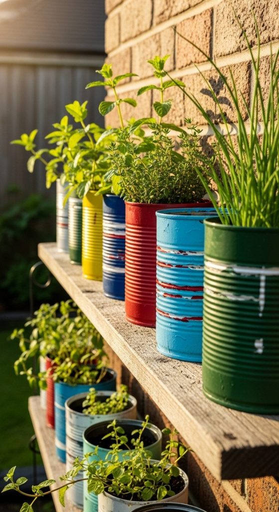 Got old coffee cans or soup tins? Don’t toss them — upcycle them into adorable herb pots with a coat of paint and some drainage holes.