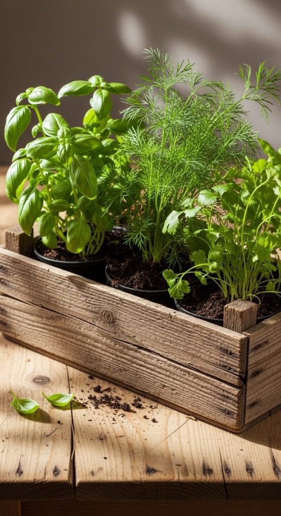 Nothing says “farmhouse chic” like herbs growing in a rustic wooden crate. Line it with plastic and fill it with potting soil for a natural, cozy display.