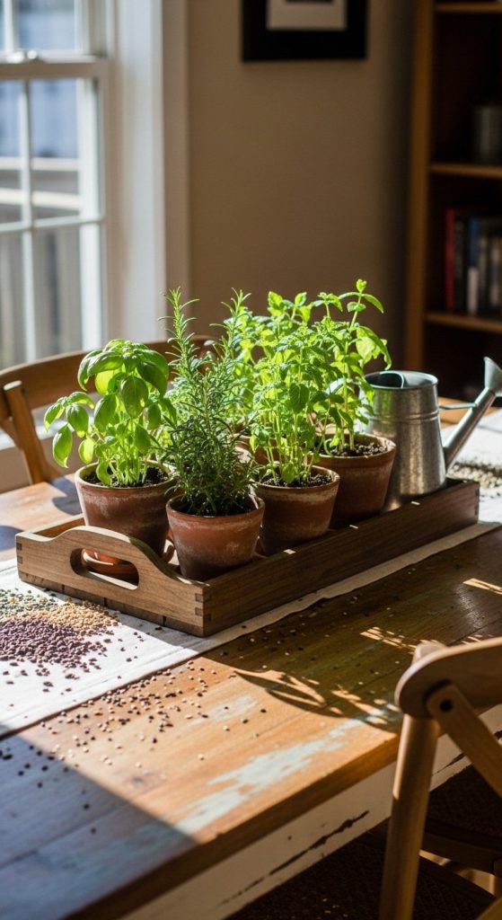 Use a shallow wooden or metal tray filled with small pots for a compact, portable herb display.