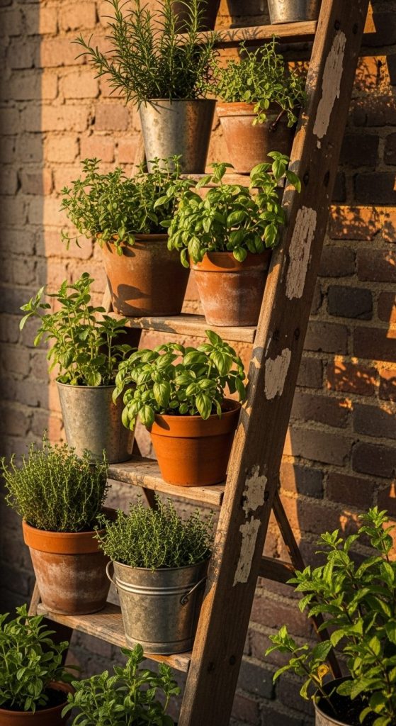 Old ladder lying around? Lean it against a wall and use each step to hold potted herbs — a rustic vertical display that’s pure charm.