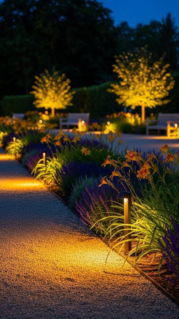 A public garden shouldn’t lose its charm after sunset. Simple path lighting, uplights for trees, or warm glow accents keep the space usable and safe.