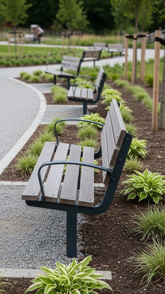Materials like teak, steel, composite wood, or stone stand up to weather and crowds. The key is placing seating where people naturally want to pause.
