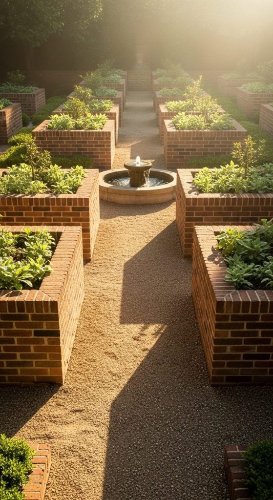 Start with geometry — a symmetrical layout with square or rectangular brick beds arranged around a focal point (like a fountain or sculpture). Architects love this structure because it creates a visual rhythm that feels calming yet deliberate.