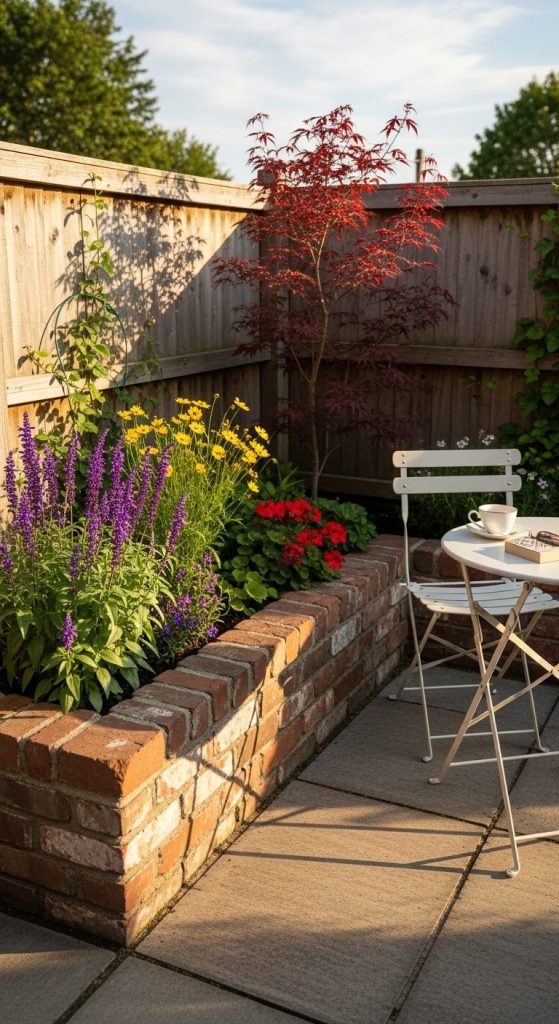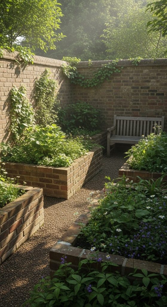 Imagine walking into a private nook surrounded by brick raised beds and partial brick walls. The feeling? Instant escape. These layouts often double as mini-retreat zones — perfect for meditation or reading.