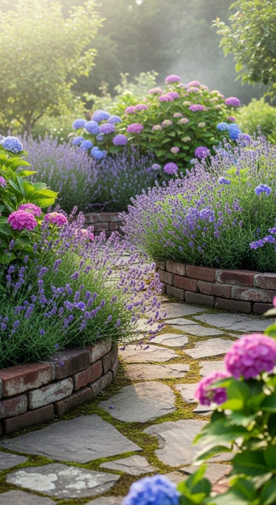 This one’s inspired by old English estates — low, weathered brick borders with overflowing flowers. Think lavender, hydrangeas, and herbs spilling over the sides. It’s effortlessly beautiful.