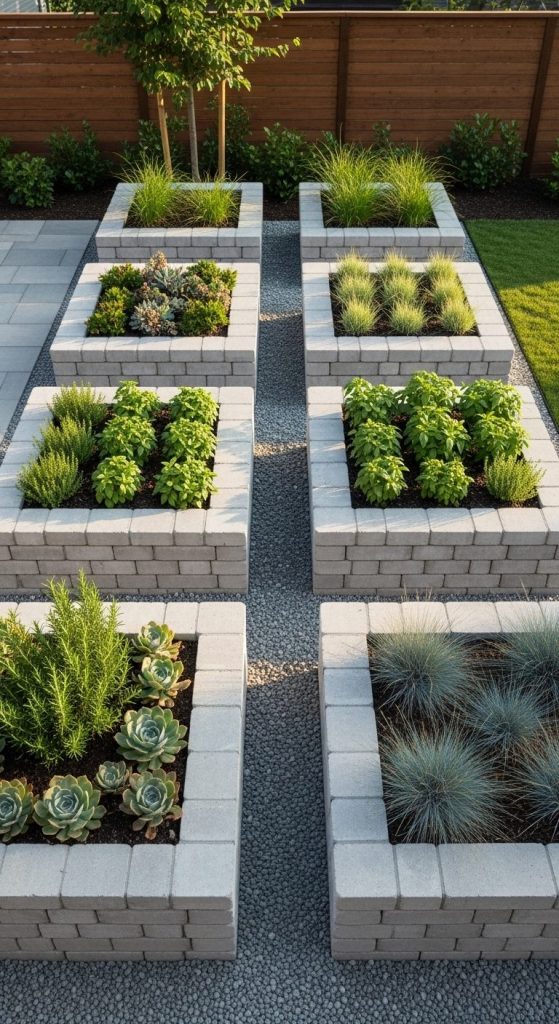 If you’re into clean lines, go for a modular raised bed grid layout. Uniform brick boxes arranged in a grid pattern can hold different plant groups — succulents, vegetables, ornamental grasses — like mini outdoor rooms.