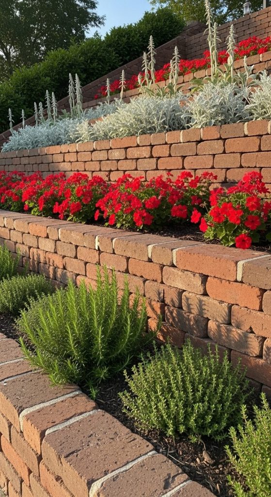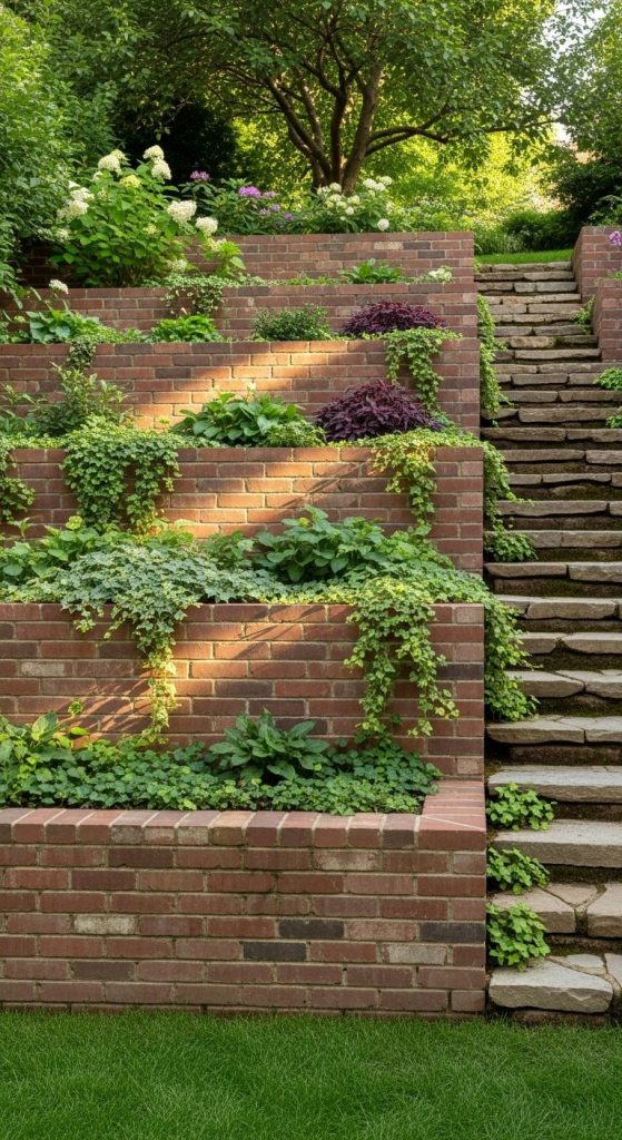 If your yard has height variation, use raised brick retaining walls to build layered garden beds. It’s both structural and beautiful — very “architectural landscaping.”