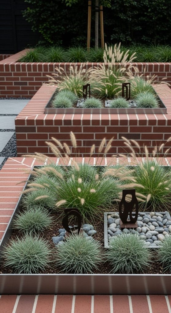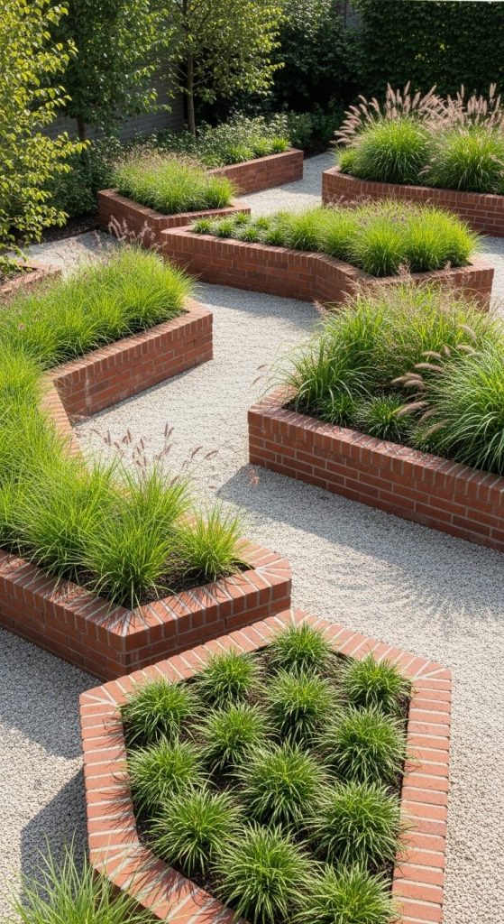 Modern meets industrial here. Pair smooth red or white brick beds with steel edging or frames for that chic, minimalist vibe. It’s like your backyard took a trip to a high-end spa.