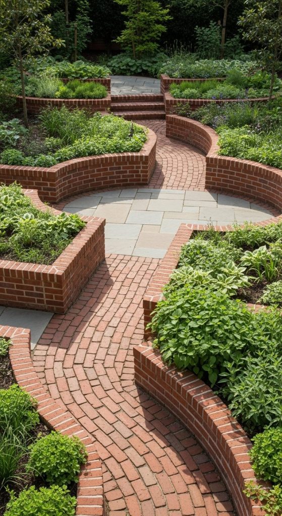 This idea combines brick garden paths with matching raised beds, creating a seamless architectural connection throughout the yard. It feels cohesive and elegant, like a design straight from Architectural Digest.