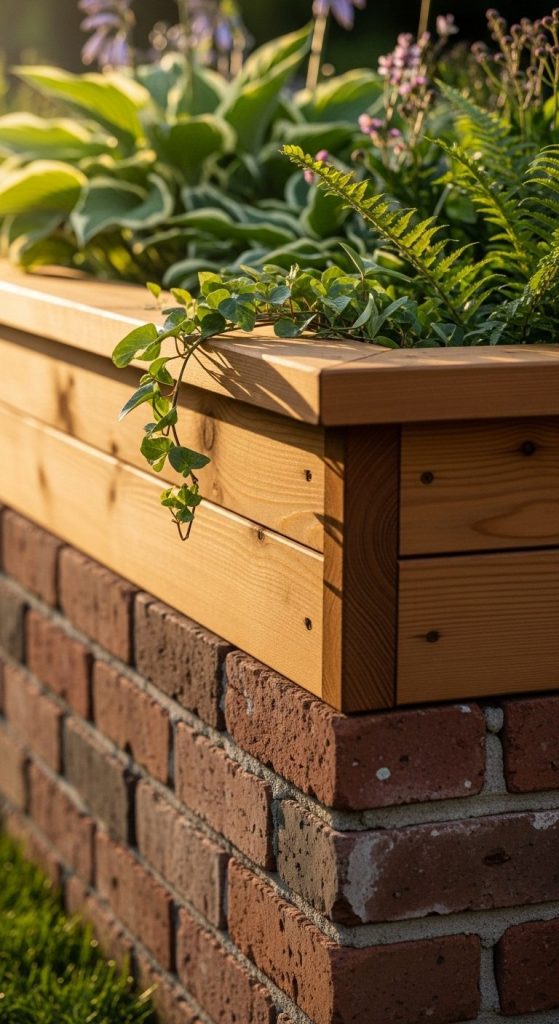 Mix wood and brick for warmth and texture. Brick for the base, wood planks for the top edge — the result? A rustic-modern hybrid that’s both practical and artistic.