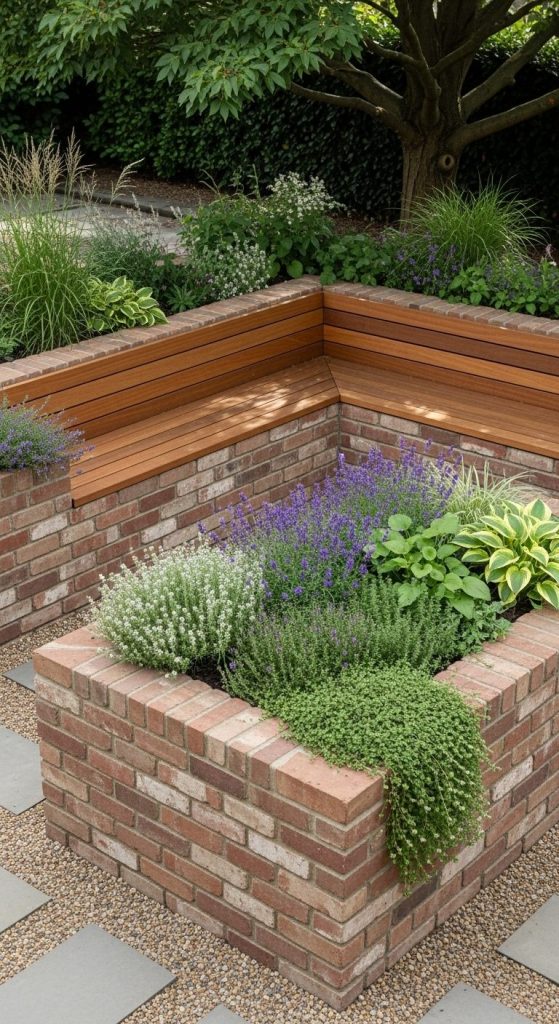 Now here’s clever — build brick raised beds with seating ledges. Double-duty design: planter plus outdoor bench. It’s perfect for patios, BBQ zones, or small courtyards.