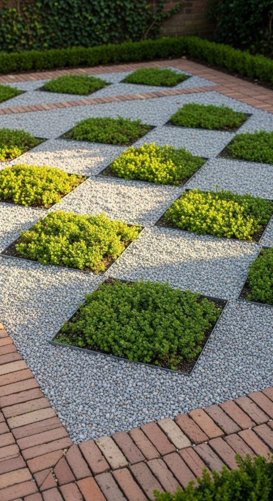 Alternate brick and gravel squares to form a grid, planting greenery in between. It’s geometric, organized, and modern — ideal for both small and large spaces.
