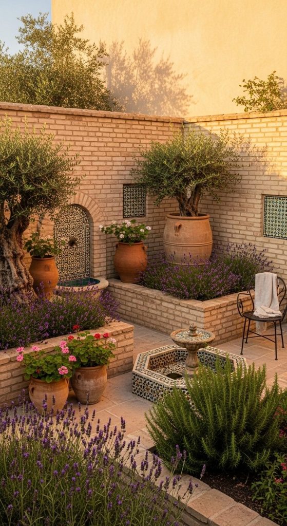 Warm tones, olive trees, lavender, and terracotta pots — yes, we’re going Mediterranean. Use pale orange or sun-washed brick for raised beds to mimic Tuscan courtyards.