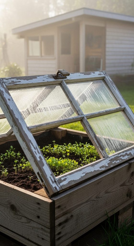Attach a clear polycarbonate lid or reclaimed window frame on top of your pallet bed. Voilà — a mini greenhouse!