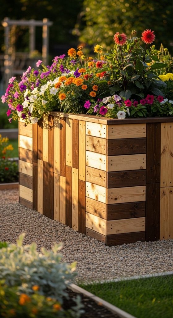 Use differently colored pallet wood pieces to create a mosaic or chevron pattern around the raised bed exterior.