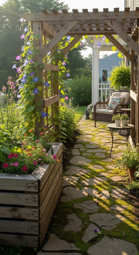 Build a small pergola frame over your pallet bed using leftover wood. Add climbing plants like morning glories or beans for a dreamy garden tunnel effect.