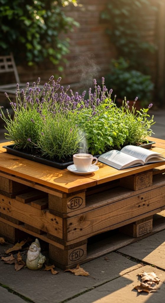 Upcycle a pallet bed into a multi-use patio piece — a central garden box surrounded by a narrow tabletop ledge.