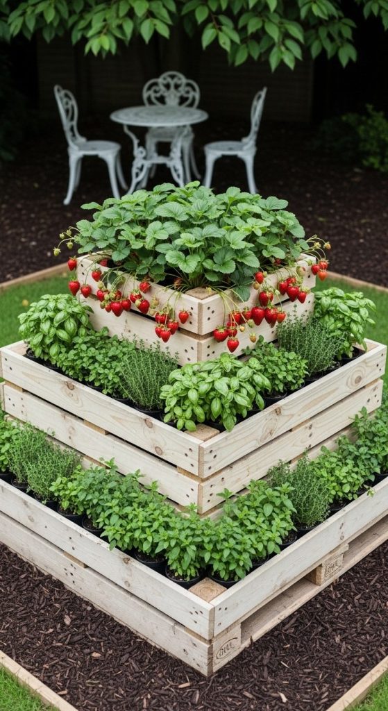 Combine multiple short pallet sections into a staircase-style raised bed that “steps” upward.