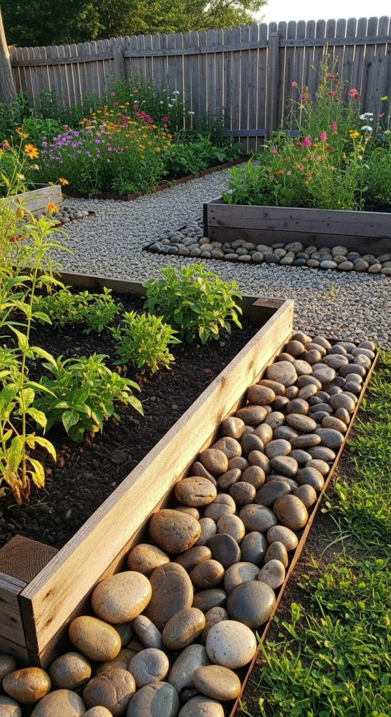 Line the outer edges of your pallet bed with river stones, pebbles, or broken tile inserts.