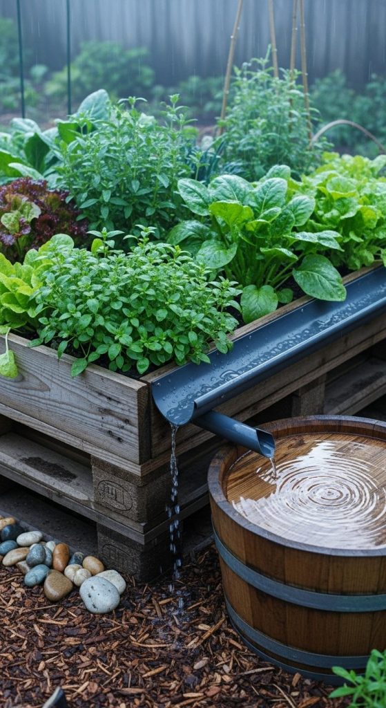 Attach a small rain gutter and barrel beside your pallet bed to collect runoff water for reuse.