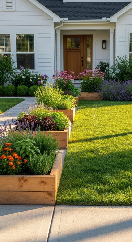 There’s something timeless about simple wooden raised garden beds in front of a home. Cedar or redwood instantly adds warmth to your curb appeal, making your entryway feel organic and inviting.