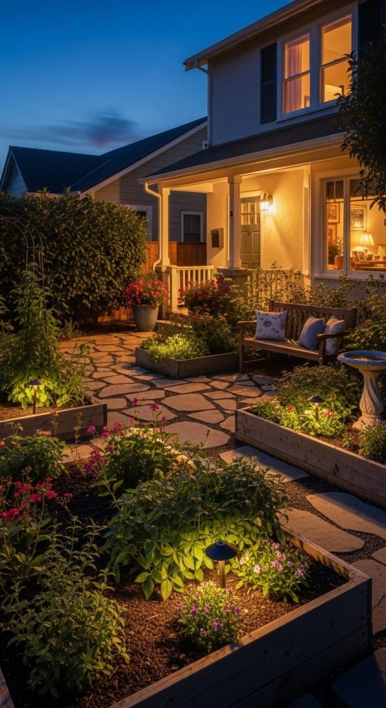 Add a small water basin or fountain near your raised garden beds—it turns your entrance into a mini oasis.