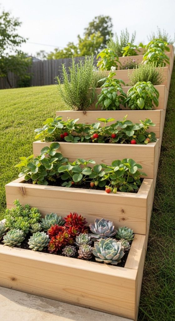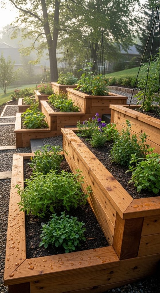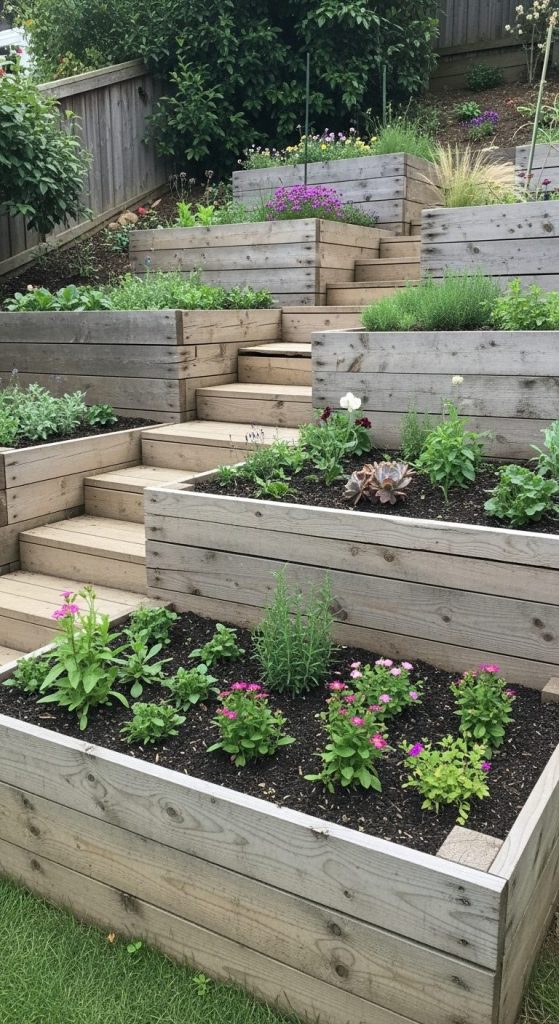 Building tiered wooden beds is one of the most classic and visually stunning ways to tackle a slope. Each tier acts as its own mini garden level—perfect for separating veggies, herbs, and flowers.