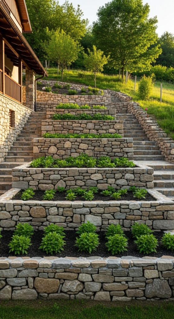 If you love a rustic, natural aesthetic, stone beds are your go-to. You can use stacked stones or bricks to create sturdy terraces that blend beautifully into the landscape.