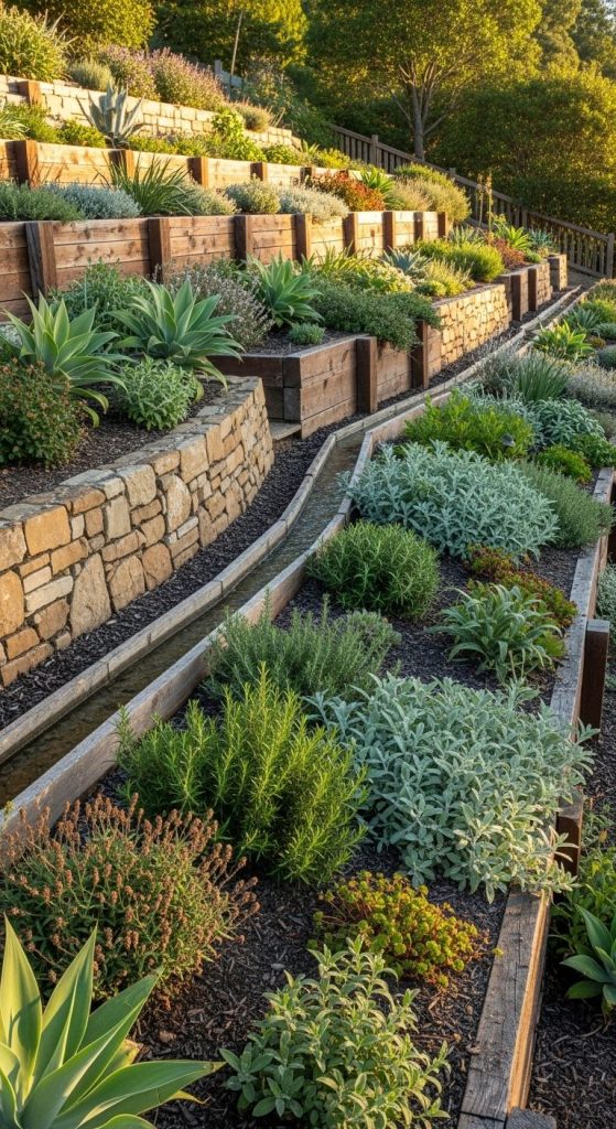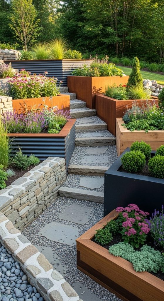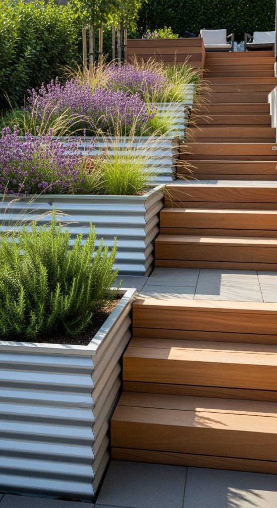 Want something industrial and modern? Corrugated metal garden beds work wonders on slopes. Pair them with wooden steps for easy access and a striking contrast in textures.