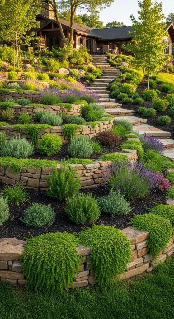 This setup turns your slope into a layered paradise—and your neighbors will think you hired a landscape designer.