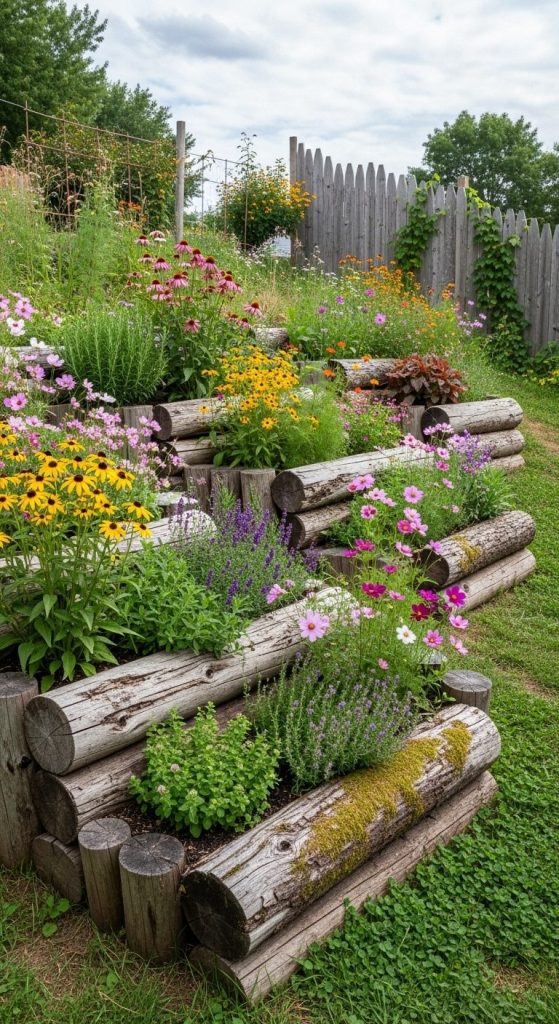 This one’s for the eco-friendly gardener. Use fallen logs or reclaimed timber to create natural, raised borders along your slope.