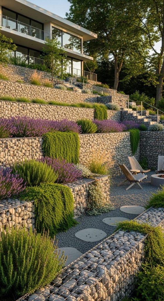 Gabions—those wire cages filled with rocks—look ultra-modern and can handle even steep slopes. Plus, they double as striking landscape features.