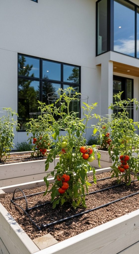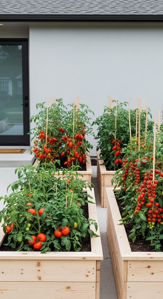 Why not go vertical? Use tall cages or trellises in your raised beds for that “mini tomato jungle” vibe.