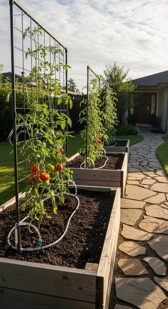 This combo is genius—install a trellis and drip system together so plants grow vertically while staying hydrated.