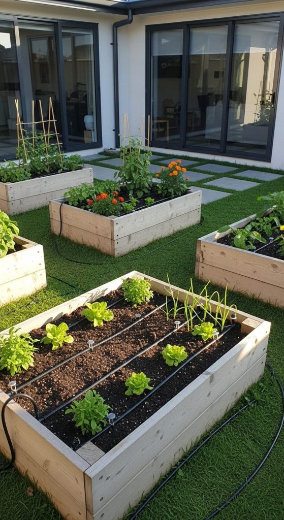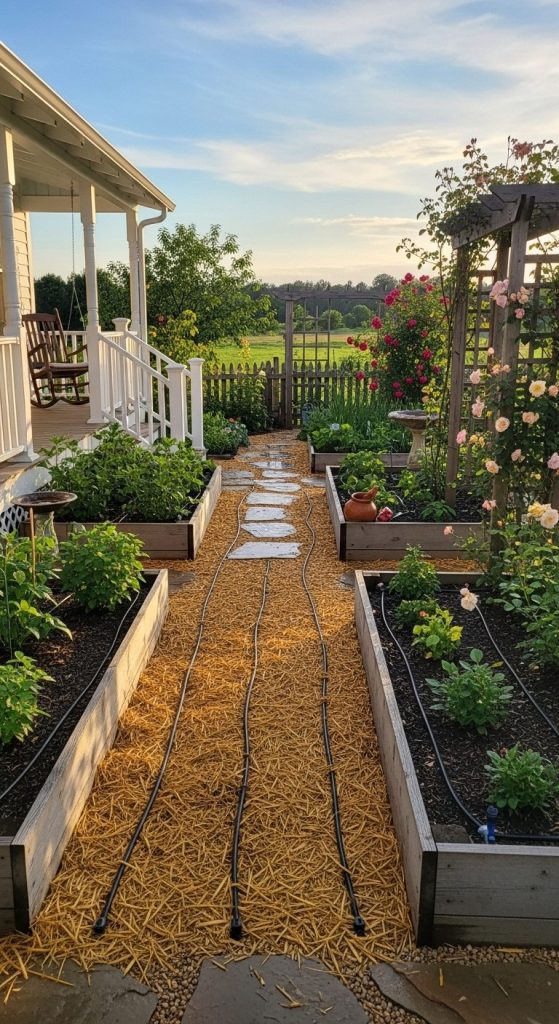 Pro tip: use straw or wood chips as mulch. It helps trap moisture from your raised garden beds watering system and gives your garden that cozy, earthy aesthetic.