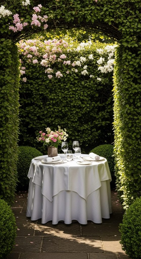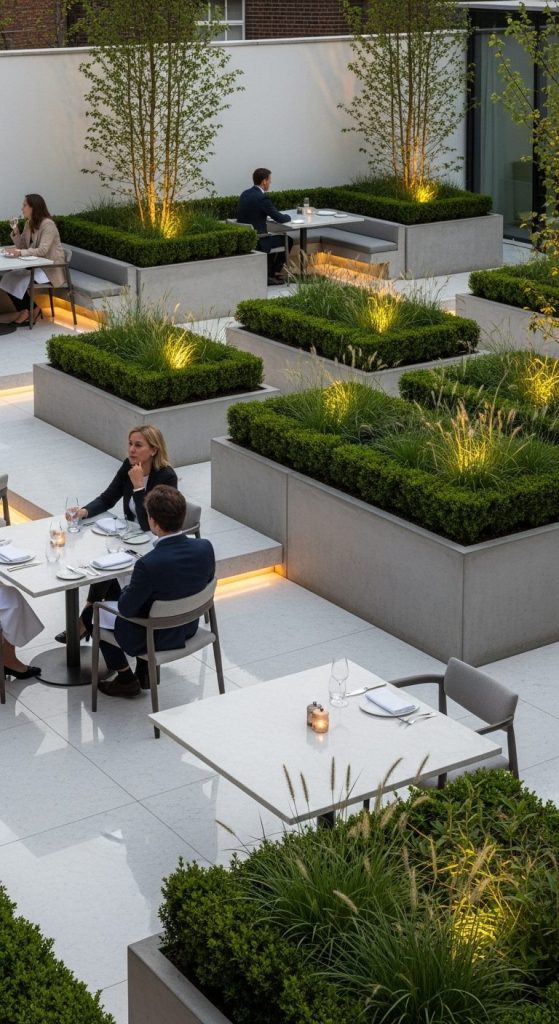 Luxury doesn’t have to be loud. Tucked-away seating alcoves framed by hedges or trellises create private, personalized dining zones that feel like hidden gems.