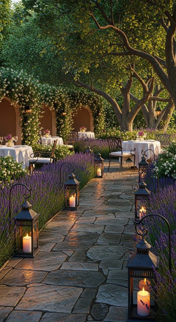 Picture a narrow stone path lined with lanterns and lavender, leading guests to intimate dining nooks. It’s a small design move that transforms the arrival experience into something cinematic.