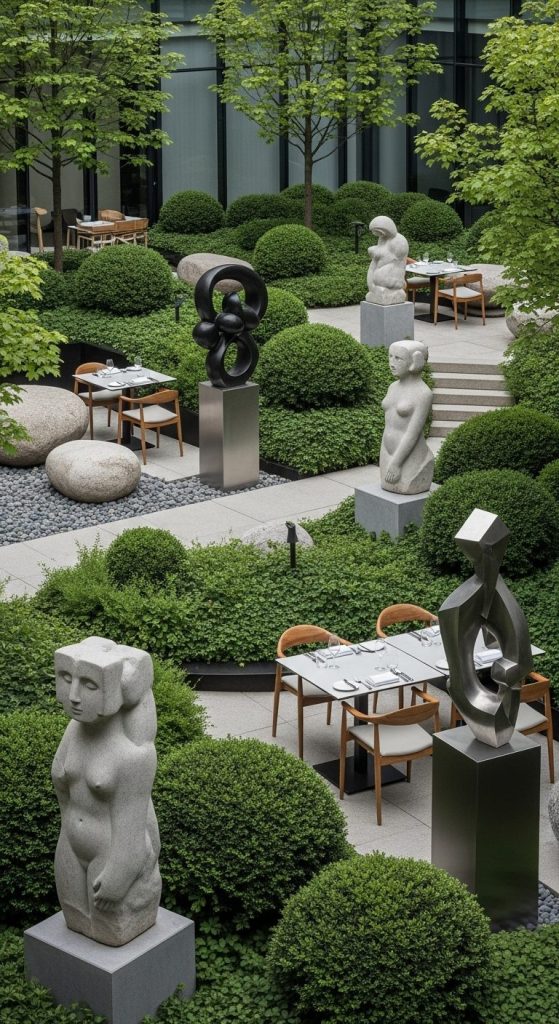 For fine dining, art and nature can share the stage. Integrating sculptures, modern art pieces, or even kinetic installations gives your garden a curated edge that mirrors your culinary artistry.