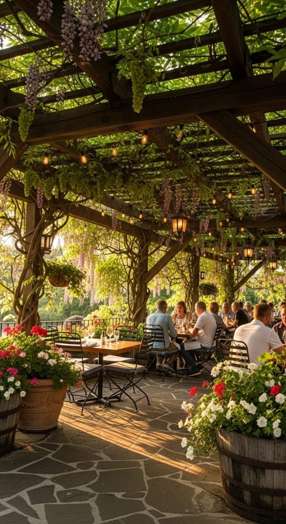 A pergola laced with grapevines, jasmine, or wisteria feels straight out of a romance novel. It’s shaded by day and dreamlike by night when paired with string lights.