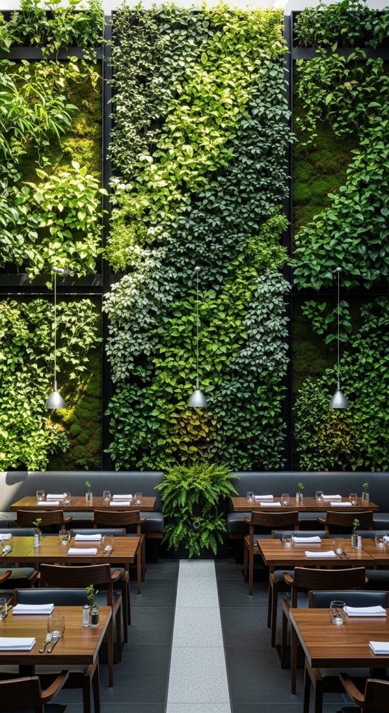 Perfect for restaurants with limited ground space, green walls deliver lush texture without sacrificing square footage. They’re modern, photogenic, and excellent for acoustics.