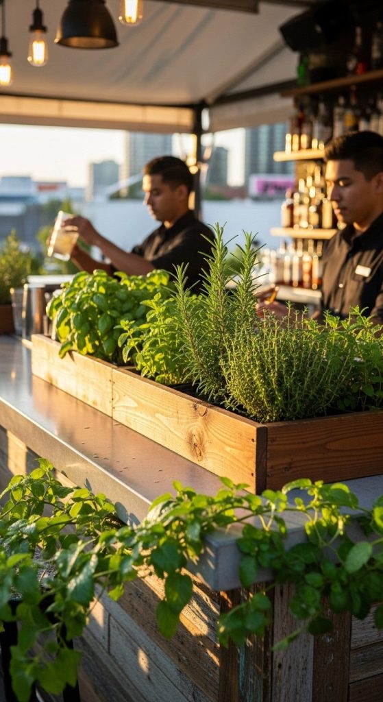 A sleek outdoor bar framed by built-in herb planters feels both functional and fresh. Guests see — and smell — ingredients that go directly into their drinks.