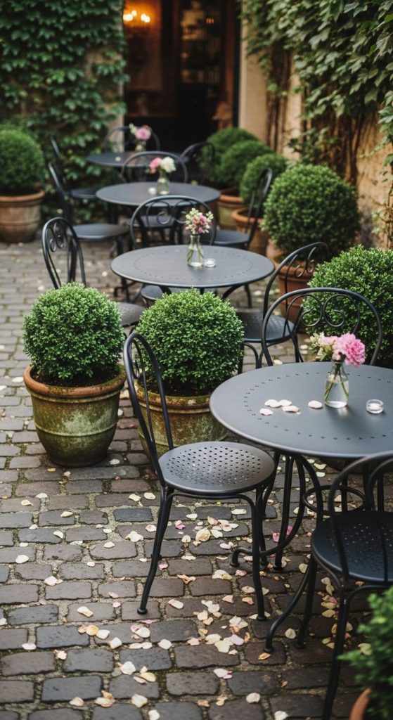 If your restaurant’s charm lies in intimacy and flair, a Parisian-style garden is pure gold. Think bistro chairs, potted boxwoods, and a touch of wrought iron — effortless elegance.
