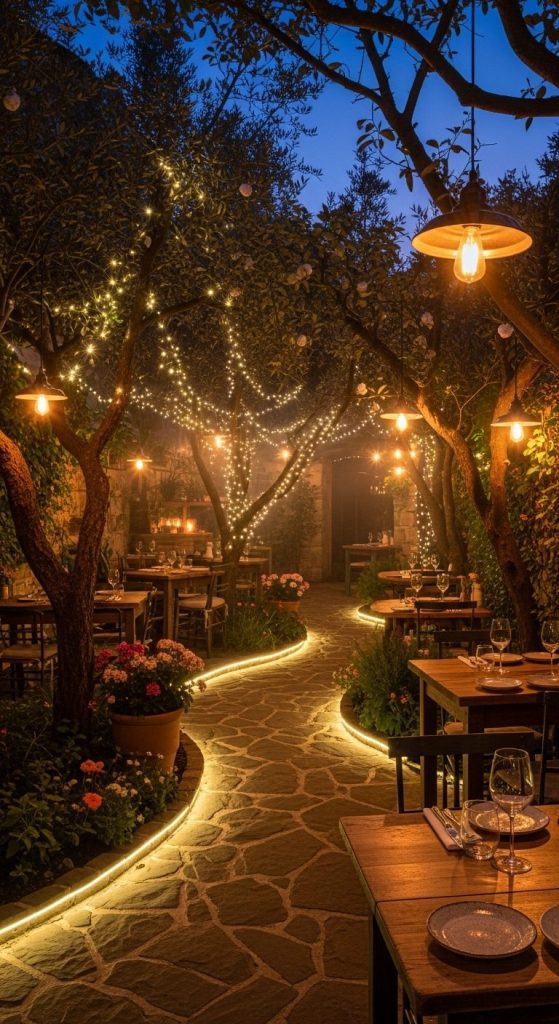 Lighting can make or break the mood. Use layered lighting — fairy lights in trees, hidden LEDs along pathways, and soft pendant fixtures over tables — to sculpt the atmosphere.