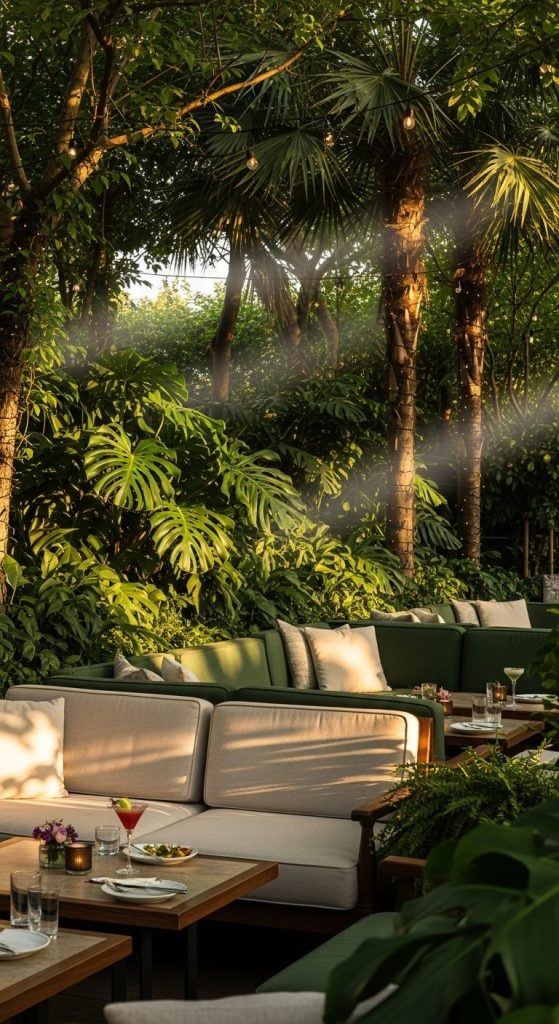 For high-end venues, comfort meets design in a lounge garden — deep sofas, outdoor rugs, ambient music, and lush foliage create a resort-level experience.