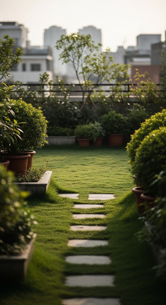 Picture a small patch of green on your rooftop — soft grass underfoot, perfect for barefoot strolls or a mini picnic.